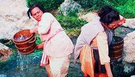 He also takes note of the fact that things could be made a bit easier there with his help. Though the lamasery has countless books of the world, no one there has ever come up with a better way of irrigating their rice paddies than making the heftier and hardier women of the land cart buckets of water uphill! Paradise indeed. Even in paradise, the blonde girl gets to waft around in silk, satin and chiffon while the grunts work like slaves in the mud! Hussey also gets to enjoy the good life (why, because she's such an amazing dancer?), lazing around wistfully or painting silkscreens of birds.
