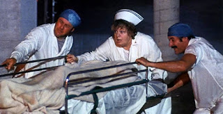 Back at the hospital, Newman is scampering around, trying to see to the new esta- blishment, which is seemingly co-run by nurse Shelley Winters. She informs him that part of the (shoddy) building lost power for a time that morning. He is also startled to find that the bedmate he left at his home that morning is also one of the new nurses on staff in the children's ward!